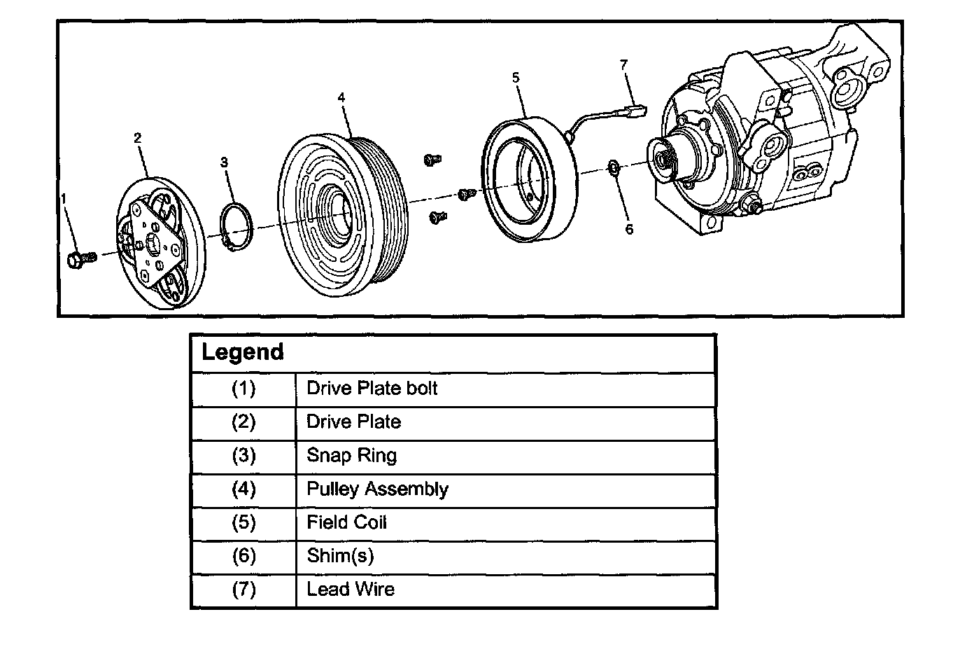 6. Install the drive plate to the compressor drive shaft together with the original shim(s) (1). Press the drive plate by hand.
