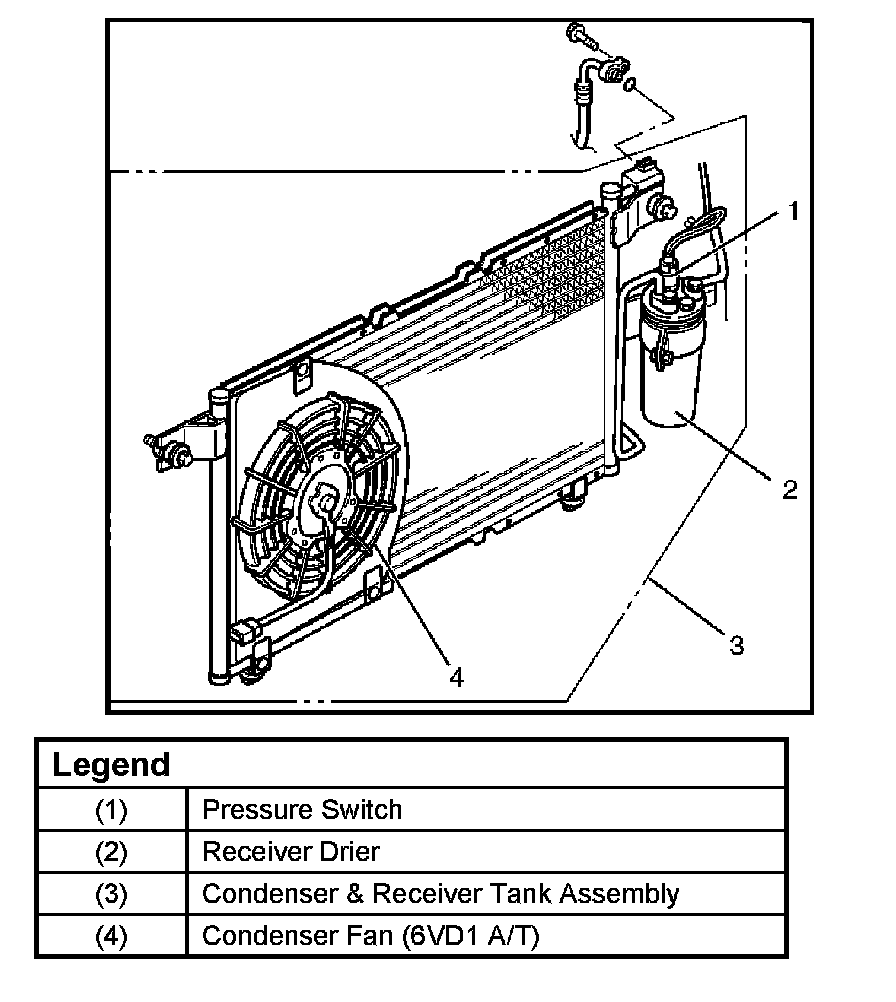 The condenser assembly is located in front of the radiator. It provides rapid heat transfer from the refrigerant to the cooling fins.