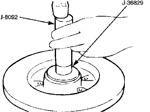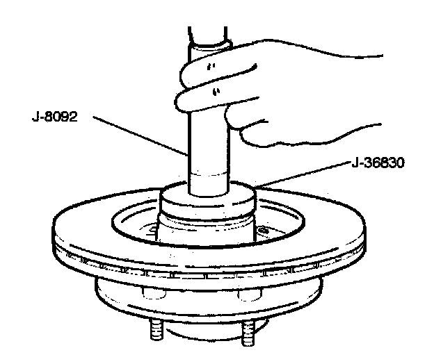 Install the outer race by driving it into the hub by using installer J-36829 and grip J-8092.