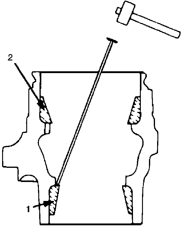 10. Use a brass bar to remove the outer bearing outer race(l), oil seal, inner bearing and inner bearing outer race (2) from the hub.
