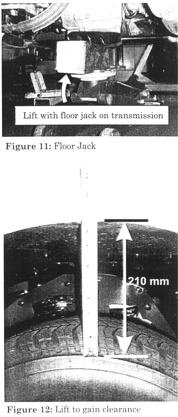 16. Place floor jack with a block of wood under the transmission and jack up the transmission. Measure the gap between the driver side tire and fender. To gain clearance between the engine and the bulkhead at the rear of the engine compartment, the gap between the tire and fender must be at least 210 mm (Figures 11 and 12).
