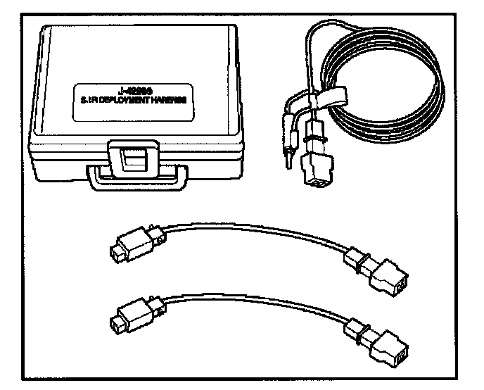 No more than two connectors are used at any time. One of the small connectors is used to substitute for the load of the driver air bag assembly when it is connected at the top of the column to the SRS coil assembly. Another small connector is used to substitute for the load of the driver air bag assembly and the SRS coil assembly when it is connected at the base of the column to the SRS wiring harness. The third small connector is used to substitute for the load of the passenger air bag assembly when connected to the passenger air bag assembly harness connector.