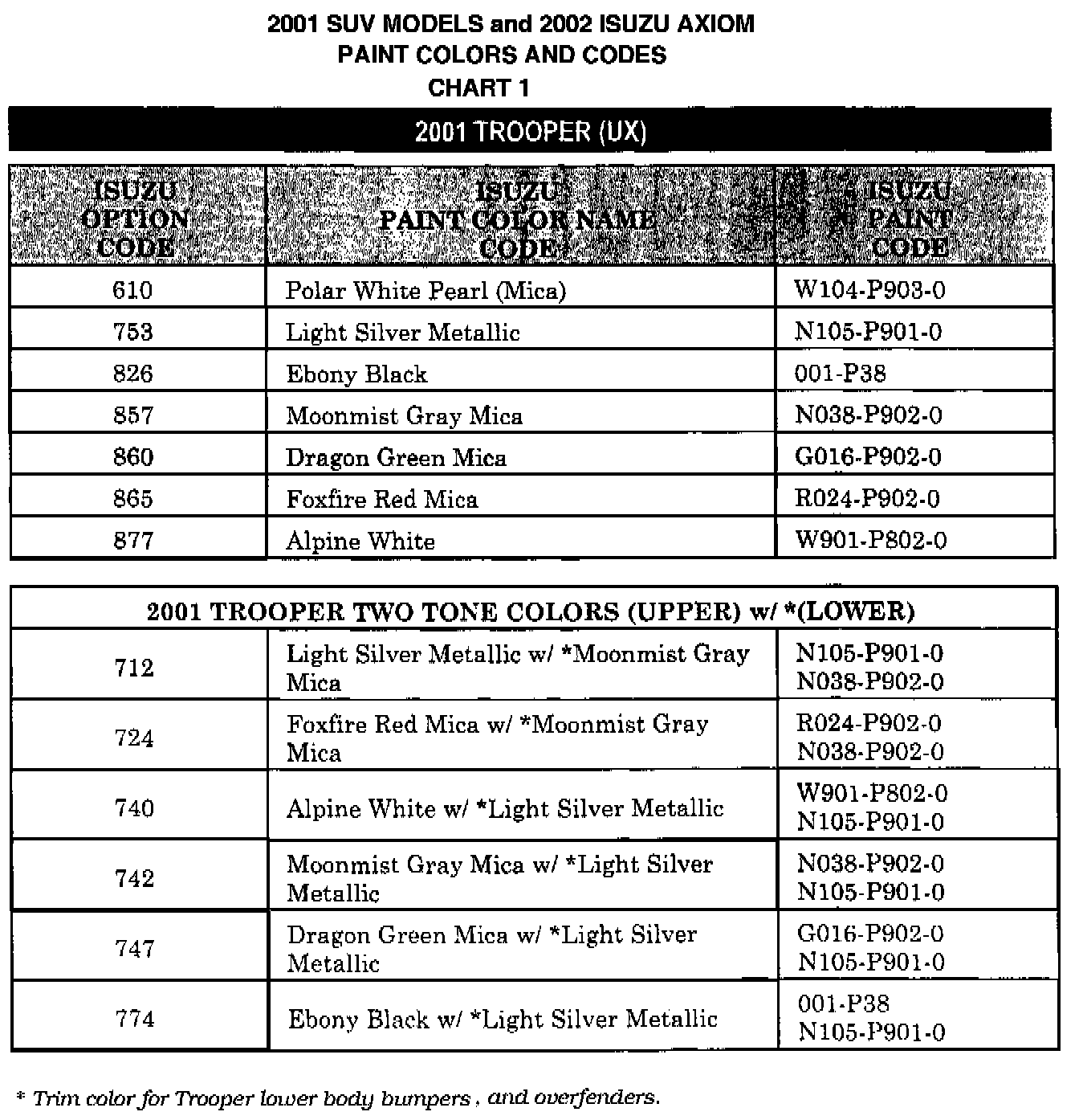 This Service Bulletin lists exterior paint color information for all 2001 Isuzu Sport Utility Vehicles and 2002 Isuzu AXIOM.
