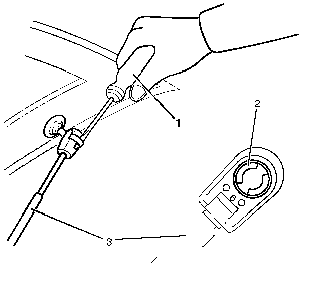 - Remove gas stay fixing screw and pull up the gas stay assembly (3) from the ball stud by spreading the retainer (2) holding the ball stud at the end of the gas stay with screwdriver (1), etc.