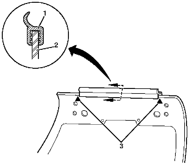 1. Attach the upper seal (1) to the hatchgate glass (2) indicated portion (3) so that the end of the glass contacts the bottom of the upper seal.