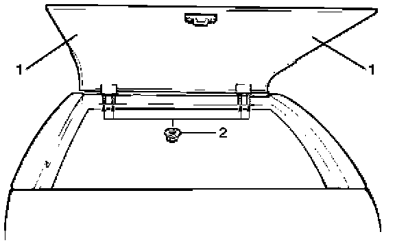 2. When installing the hatchgate glass, first attach the hinge to the hatchgate glass. Align the stud of the hinge to the hole at body while supporting the hatchgate glass with two people at indicated positions (1), and then partially tighten the hinge to body nut (2).