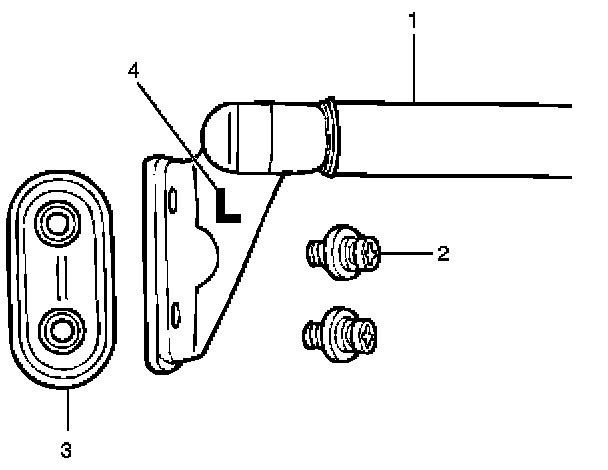 3. When installing gas stay assembly (1), first install the gas stay onto the rear quarter panel with fixing screw (2) and fastener (3) and then attach the gas stay upper end to the ball stud by spreading the retainer with screwdriver, etc. Gas stay assemblies for left and right sides differ from each other (The letter (4) L (LH) or R (RH) is embossed on the gas stay assembly.)