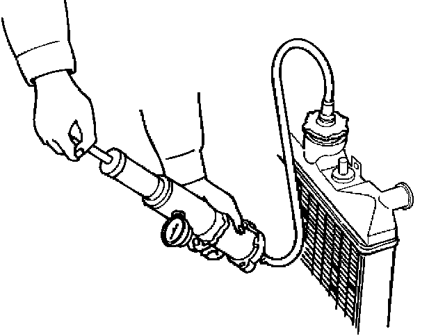 Use a radiator cap tester to force air into the radiator through the filler neck at the specified pressure of 147 kPa (23.1 psi) with a cap tester: