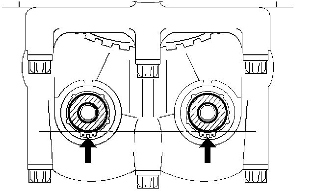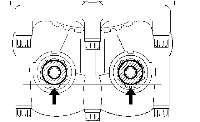 2. Turn balancer shafts until the flattened sides (arrows) of both balancer shafts face downward and are on a horizontal line.