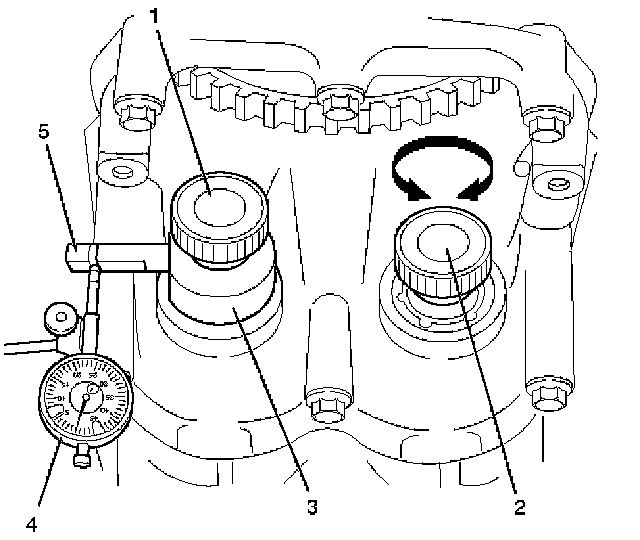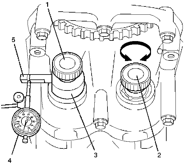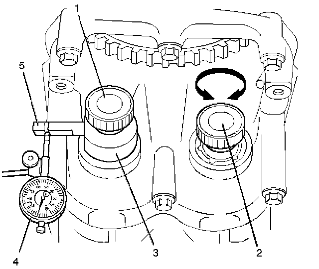 3. Screw measuring device J-43038 (3) with long knurled bolt (1) into 1st balancer shaft (intake side) and tighter hand-tight measuring arm (5) must point in "9 o'clock" direction shown in this illustration.