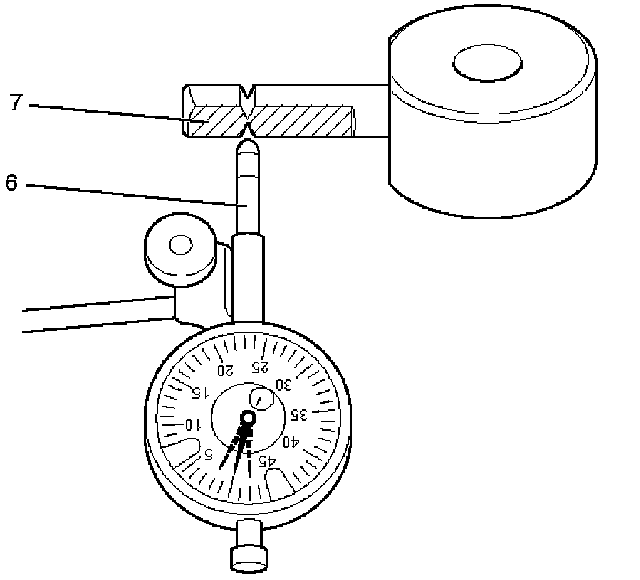 4. Place pre tensioned probe (6) of gauge on measuring arm of measuring device J-43038. The probe must be set precisely between the notch marks, square to the plane surface (7).