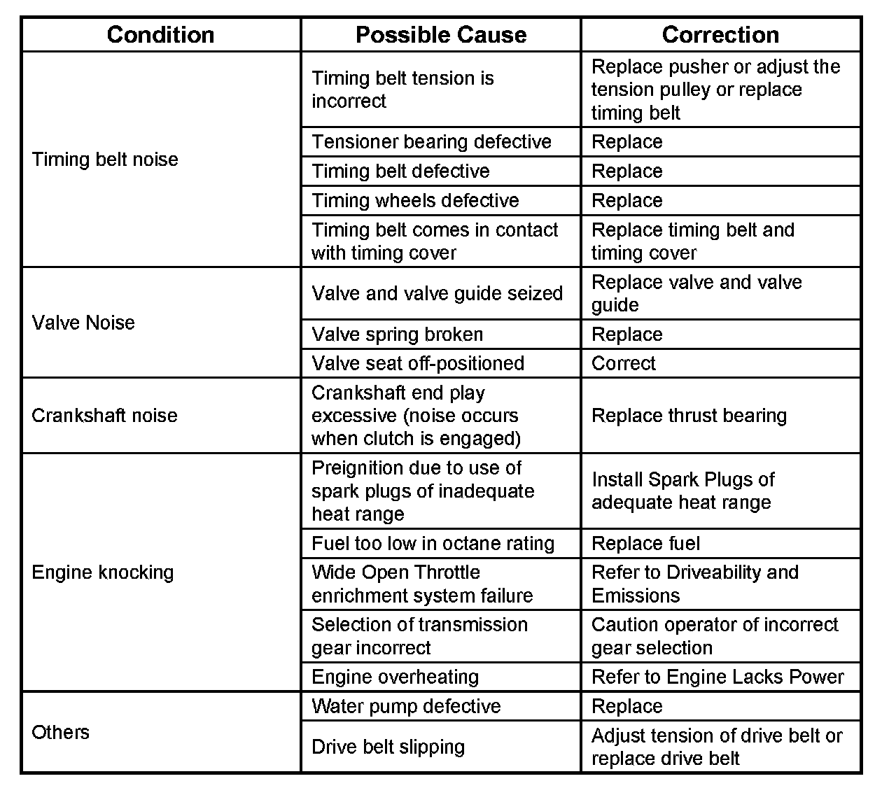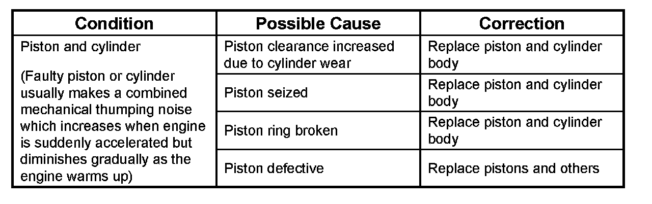 ENGINE NOISYAbnormal engine noise often consists of various noises originating in rotating parts, sliding parts and other moving parts of the engine. It is, therefore, advisable to locate the source of noise systematically.
