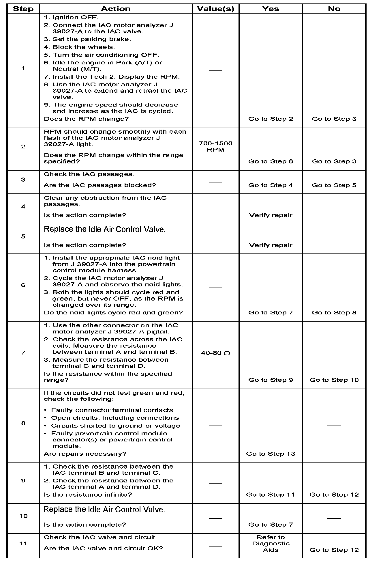 Tech 2 counts will be above 60 if idle is too low, and zero counts if idle is too high. The following checks should be made to repair a non-IAC