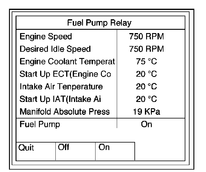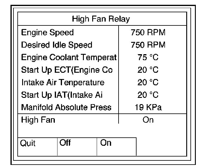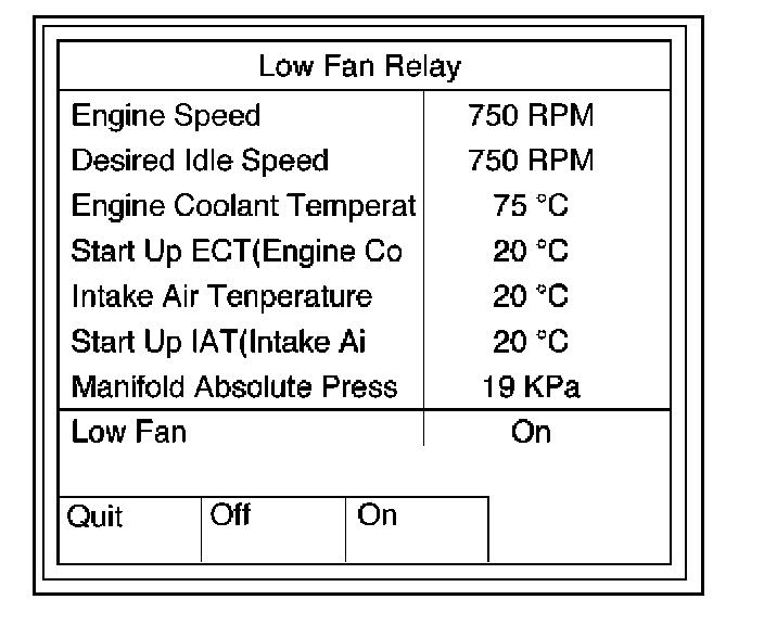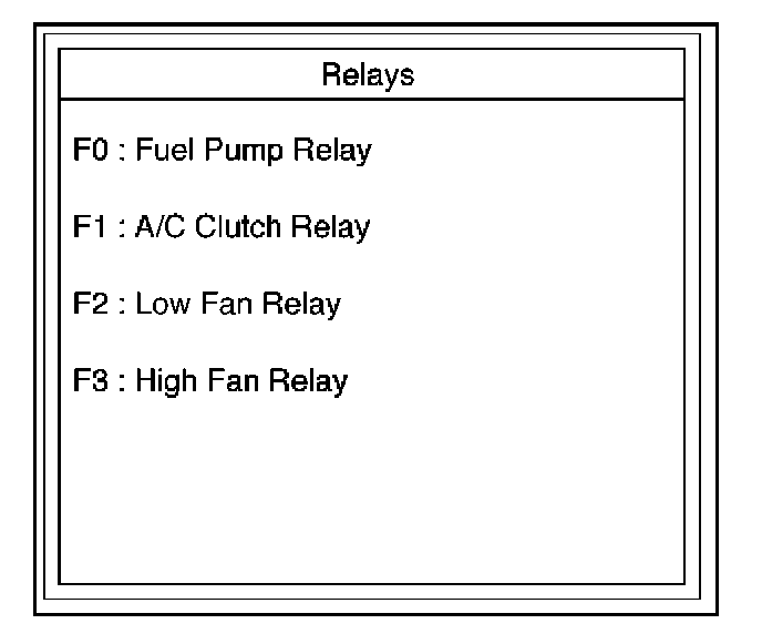 This test is conducted to check Fuel Pump Relay, A/C Clutch, Low Fan and High Fan for proper operation.Tech 2 must be used for this test.
