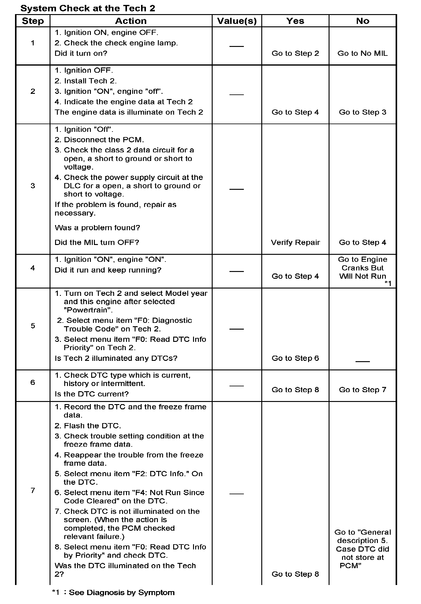 1. Turn on the ignition and check the check engine lamp. If it is not turned on, execute Miscellaneous Test at Tech 2. (Refer to "Miscellaneous Test" and if problems are found, repair a blown bulb or a short circuit.