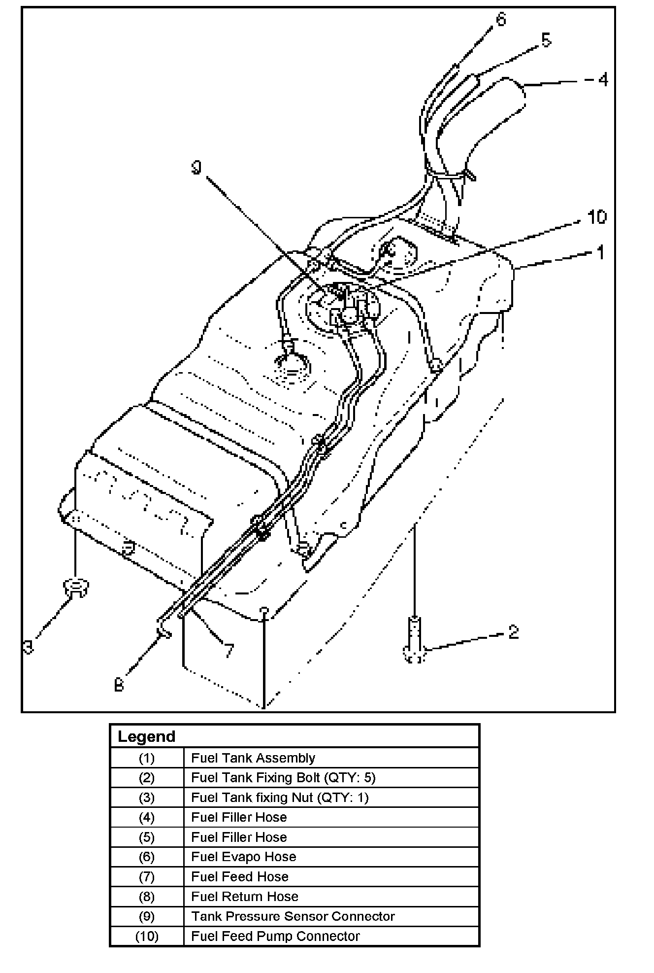 4. Support underneath of the fuel tank assembly (1) with a lifter.