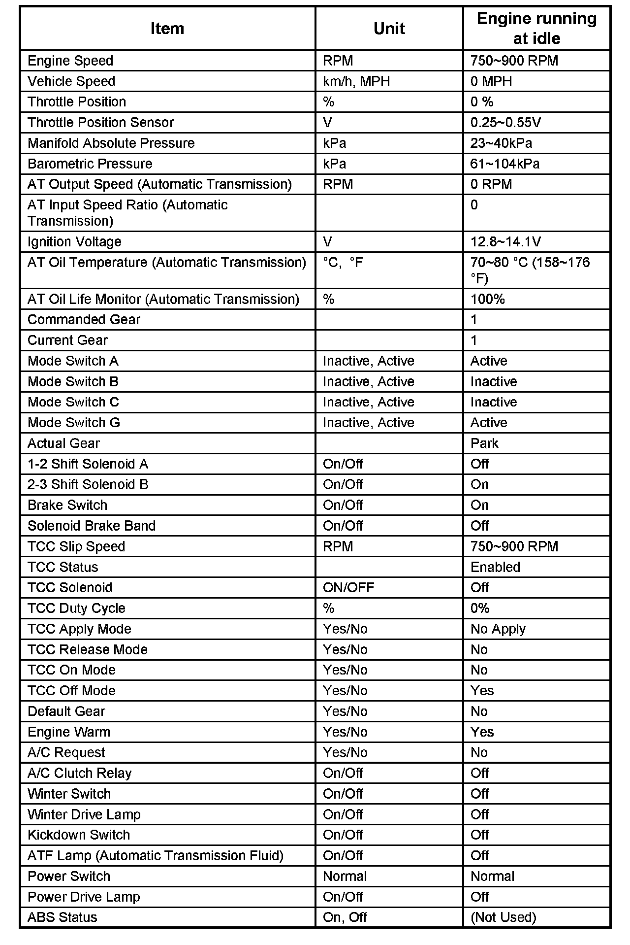 Preconditions: P-N position, idle engine speed, no vehicle speed
