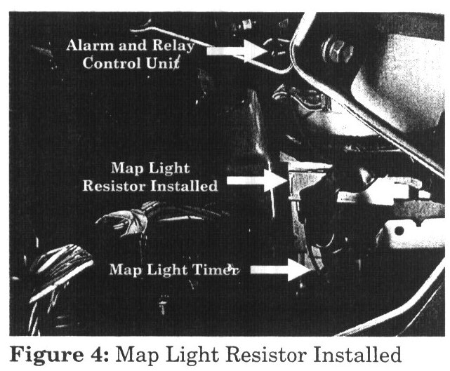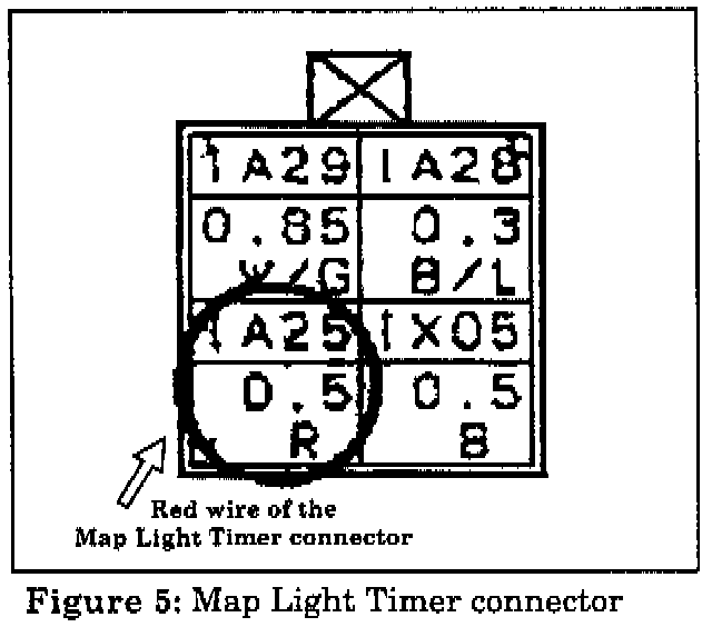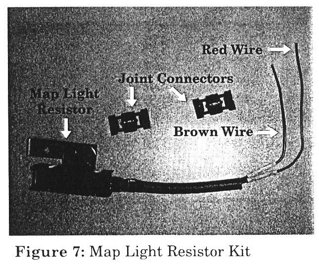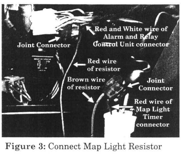 5. Attach the Brown wire of the resistor to the Red wire of the Map Light Timer connector. (Figures 3, 5 and 7)