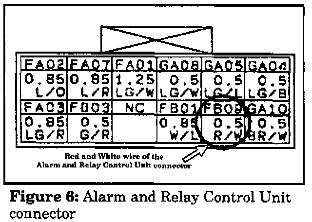 7. Attach the Red wire of the resistor to the Red and White wire of the Alarm and Relay Control Unit connector. (Figures 3, 6 and 7)