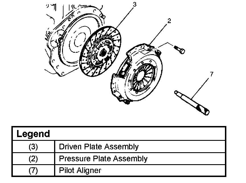 2. Use the clutch pilot aligner (7) J-42877 to prevent the driven plate assembly from falling free.