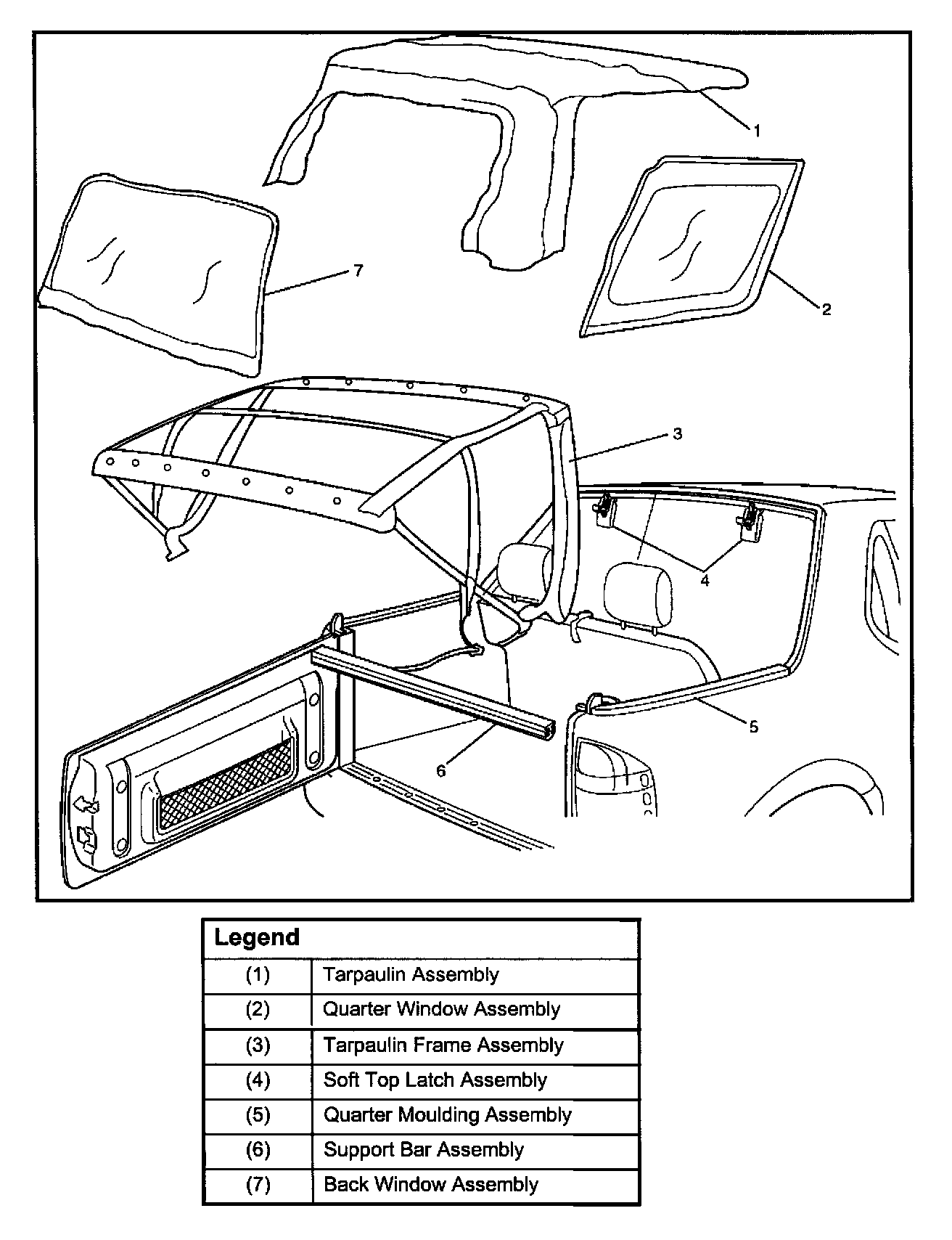 - Peel off the velcro fasteners (3), unzip the zipper (1) and pull the back window assembly toward the rear together with the support bar assembly (4). then slide the back window out to the side.