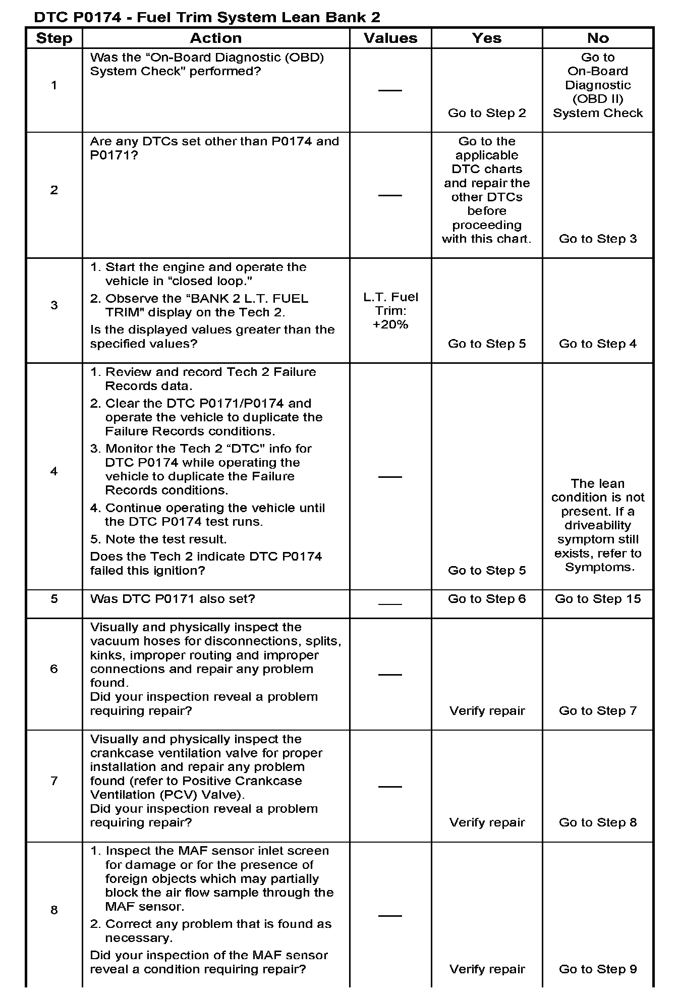 2. DTCs other than P0171 and P0174 may indicate a condition present which may cause a lean condition. If this is the case, repairing the condition which caused the other DTC will most likely correct the DTC P0171 /P0174.