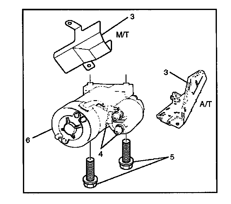 6. Remove starter assembly mounting bolts on inside and outside (5).