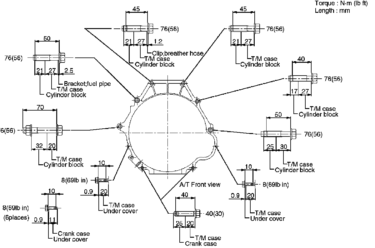 2. Tighten engine transmission bolts, to the specified torque.