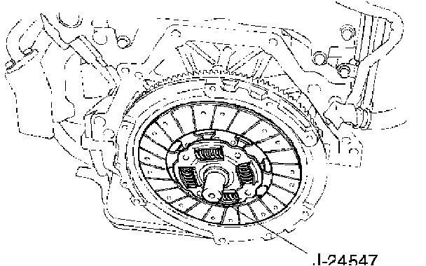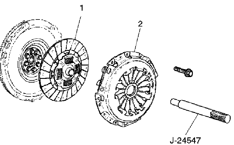 3. Remove driven plate assembly (1), use the pilot aligner J-24547 to prevent the driven plate assembly (1) from falling free.