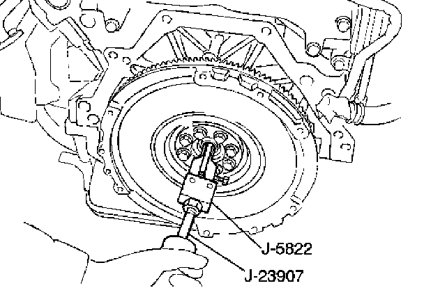 11. Use the remover J-5822 and sliding hammer J-23907 to remove the crankshaft bearing