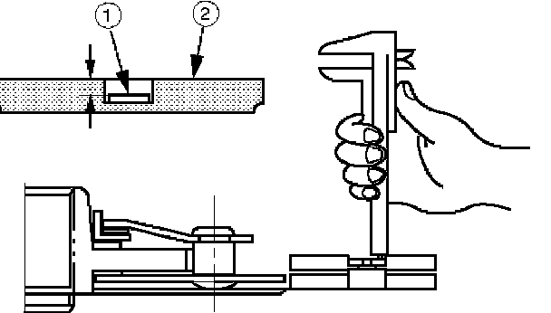 1. Use a depth gauge or a straight edge with steel rule to measure the rivet head depression 1 from the facing surface 2.