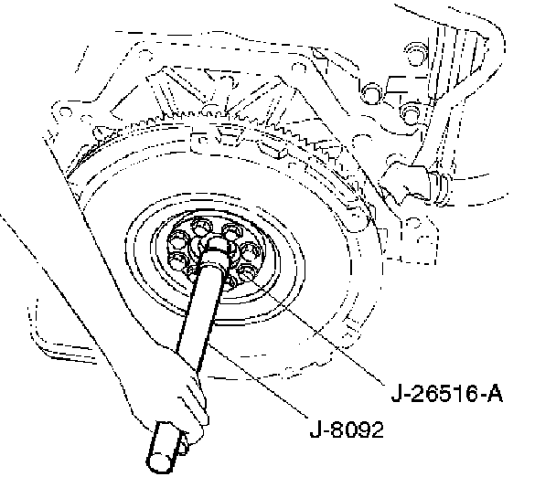 1. Install flywheel assembly and crankshaft bearing, use the installer J-26516-A and driver handle J-8092 to install the crankshaft bearing then clean and lubricate with grease.