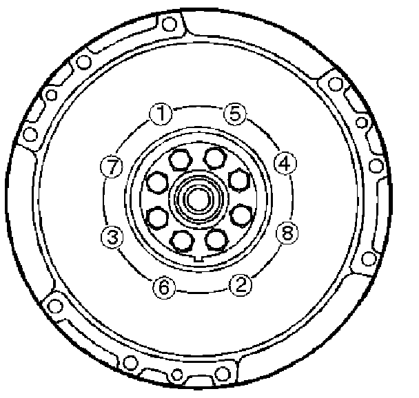 2. Install new flywheel fixing bolts in the order illustrated and tighten them to the specified torque.