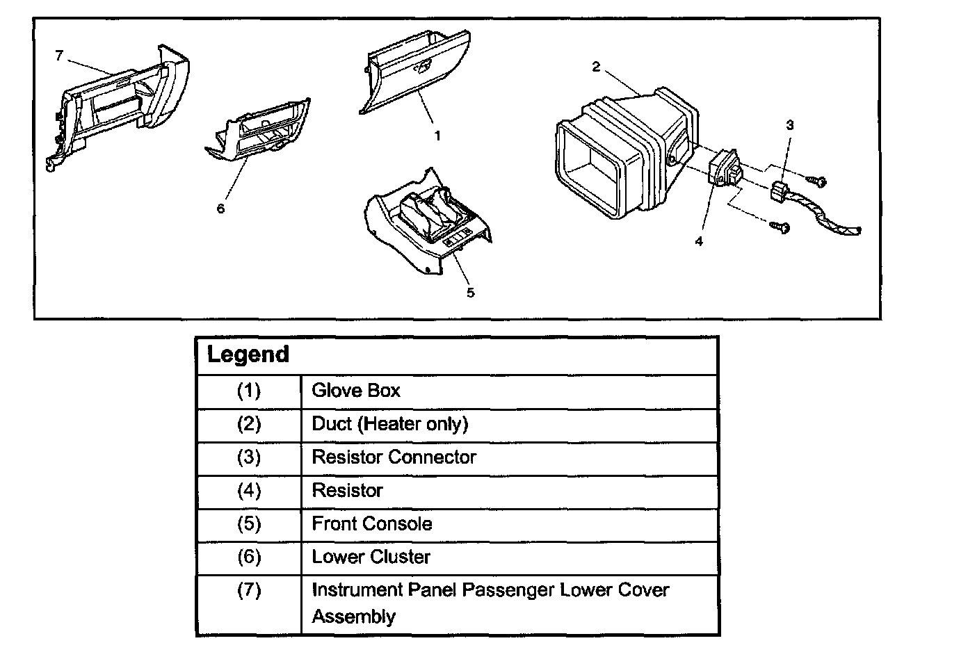 5. Remove instrument panel passenger lower cover assembly. Refer to Instrument Panel, Gauges and Warning Indicators.