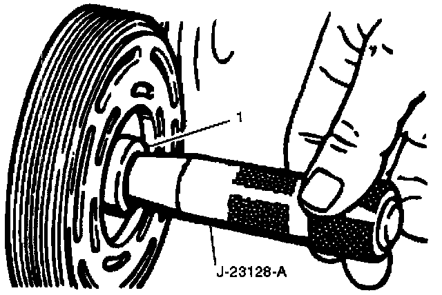 6. Fully engage the knurled tangs of Seal Remover-Installer J-23128-A into the recessed portion of the Seal (1) by turning the handle clockwise. Remove the Seal from the compressor with a rotary-pulling motion. Discard the seal. The handle must be hand-tightened securely. Do not use a wrench or pliers.