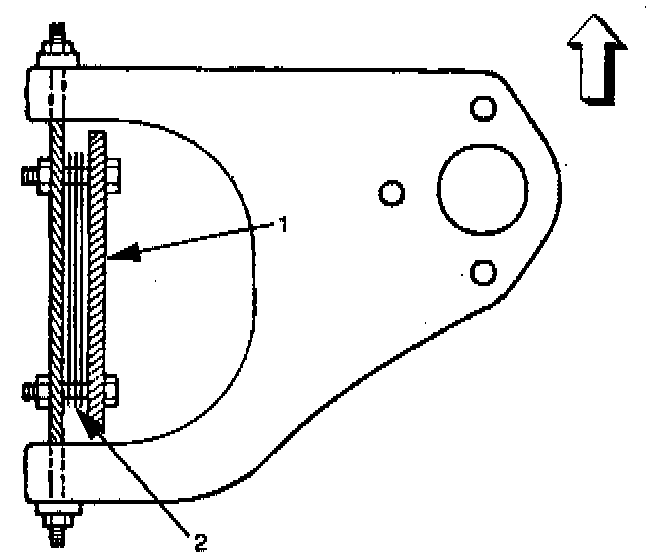 The camber angle can be adjusted by means of the camber shims(2) installed in position between the chassis frame(1) and fulcrum pins