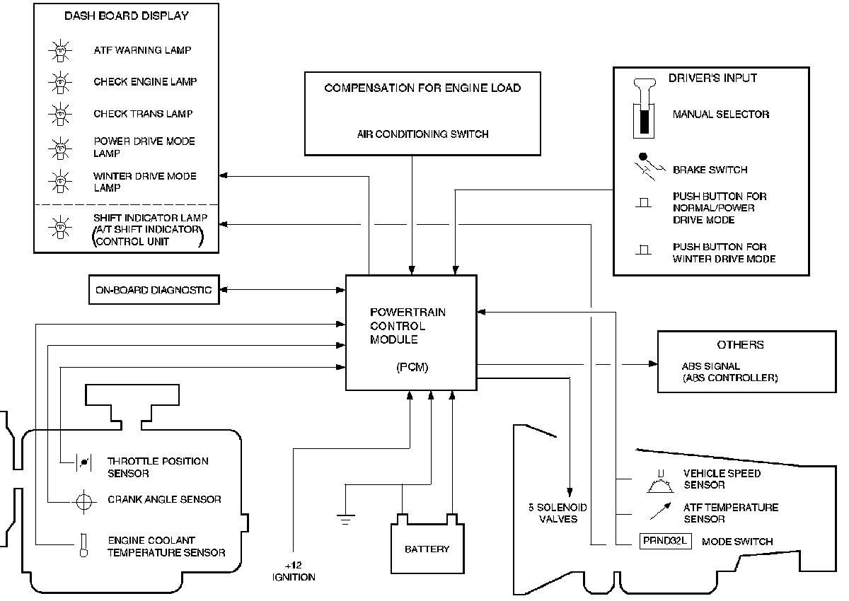 If a major system failure occurs which could affect safety or damage the transmission under normal vehicle operation, the diagnostic system detects the fault and overrides the Powertrain Control Module (PCM).