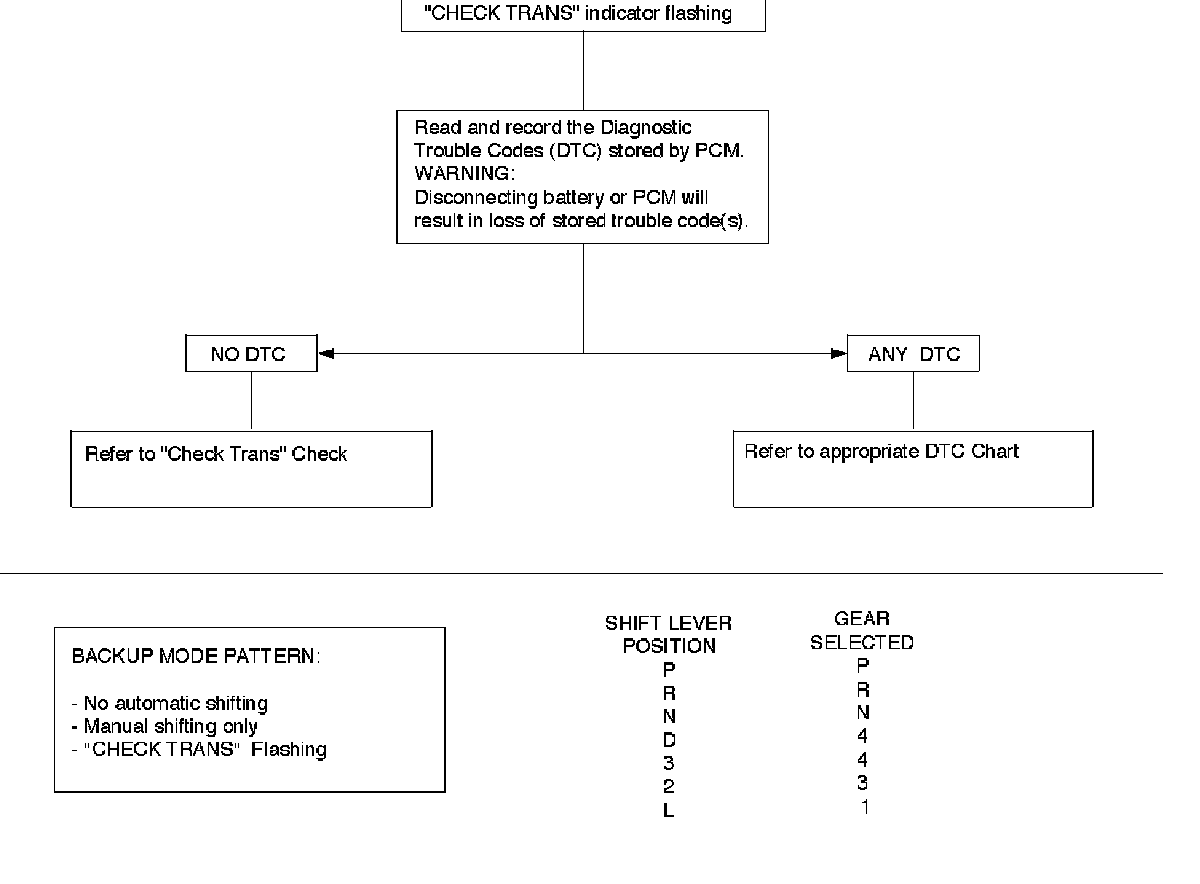 Perform Preliminary Inspection First!When the "CHECK TRANS" indicator is flashing, it indicates that a problem related to the transmission, the Powertrain Control Module (PCM), or the vehicle harness has occurred.
