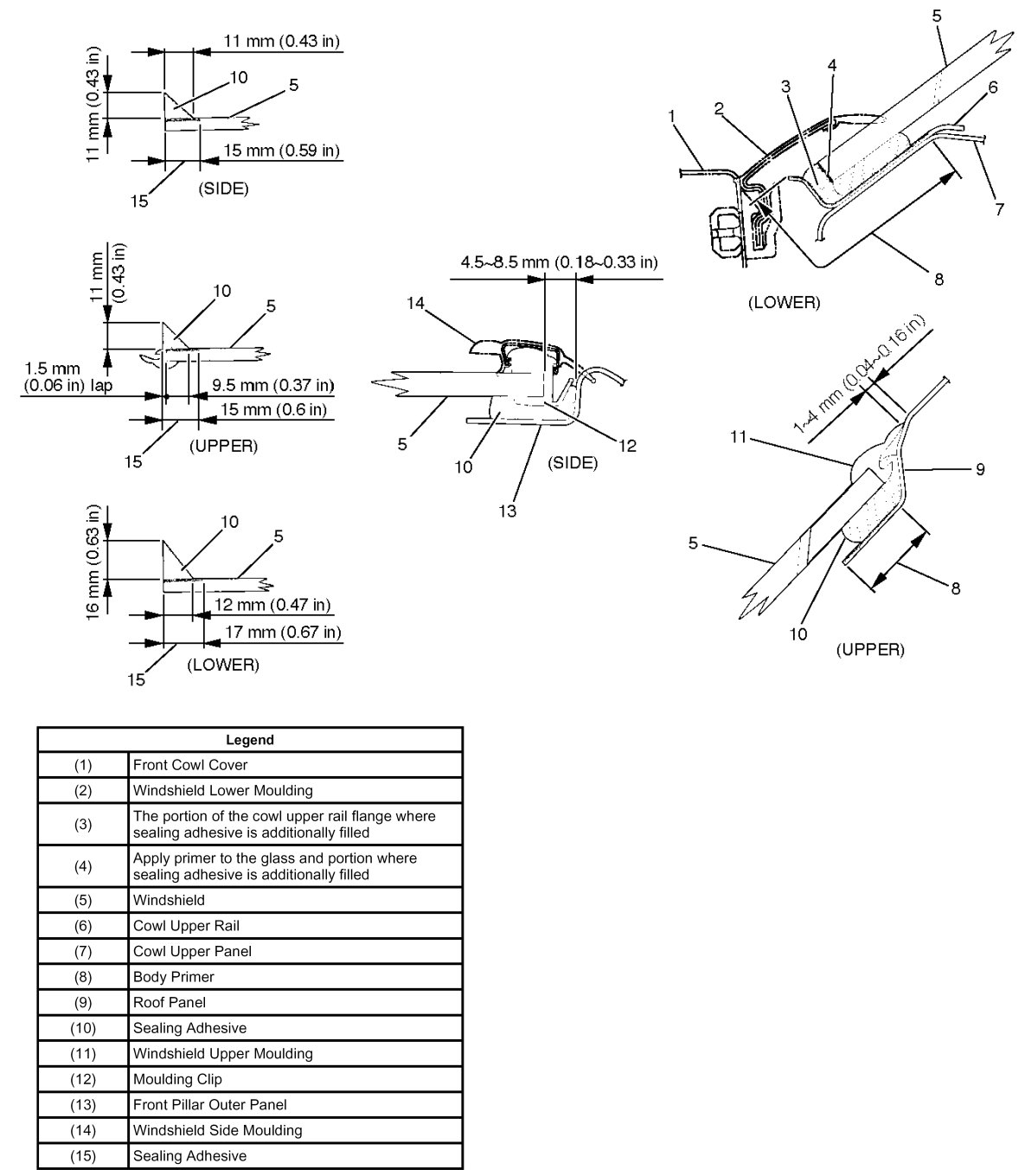 - Apply the sealing adhesive to the flange portion of the cowl upper rail.