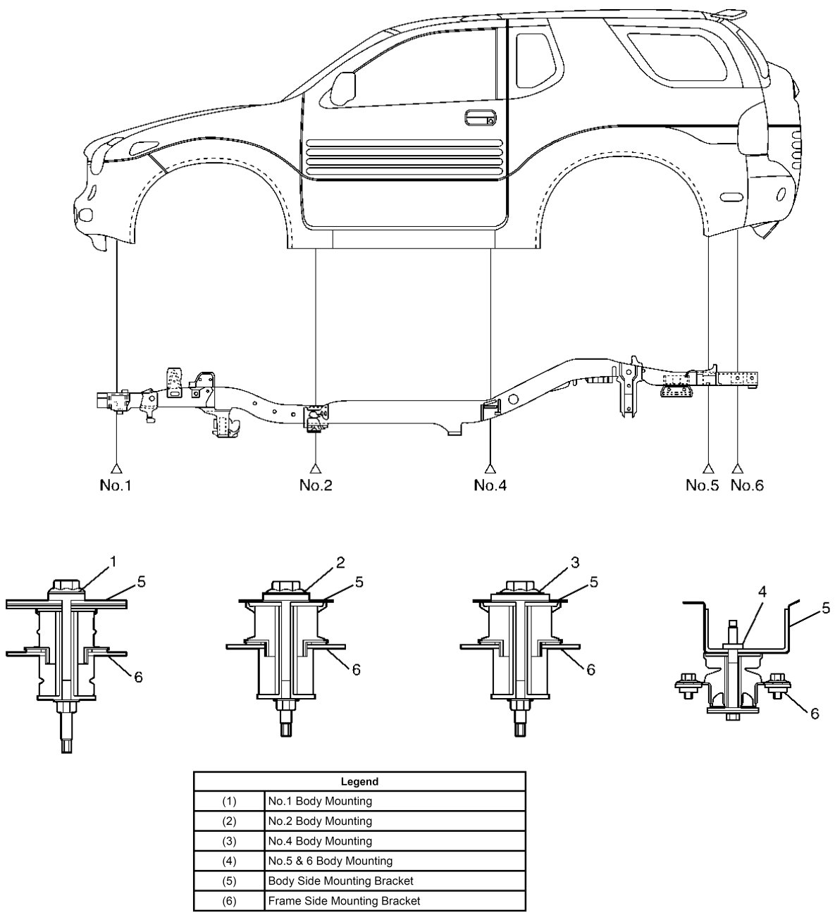 Body MountingParts LocationTightening TorqueTighten the body mounting bolts to specified torque.