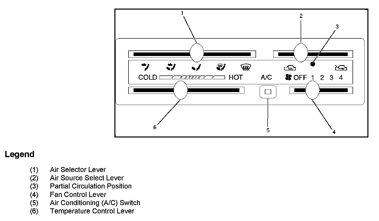 5. Defrost - In this position, most of the air is delivered to the windshield and a small amount is delivered to the side windows.