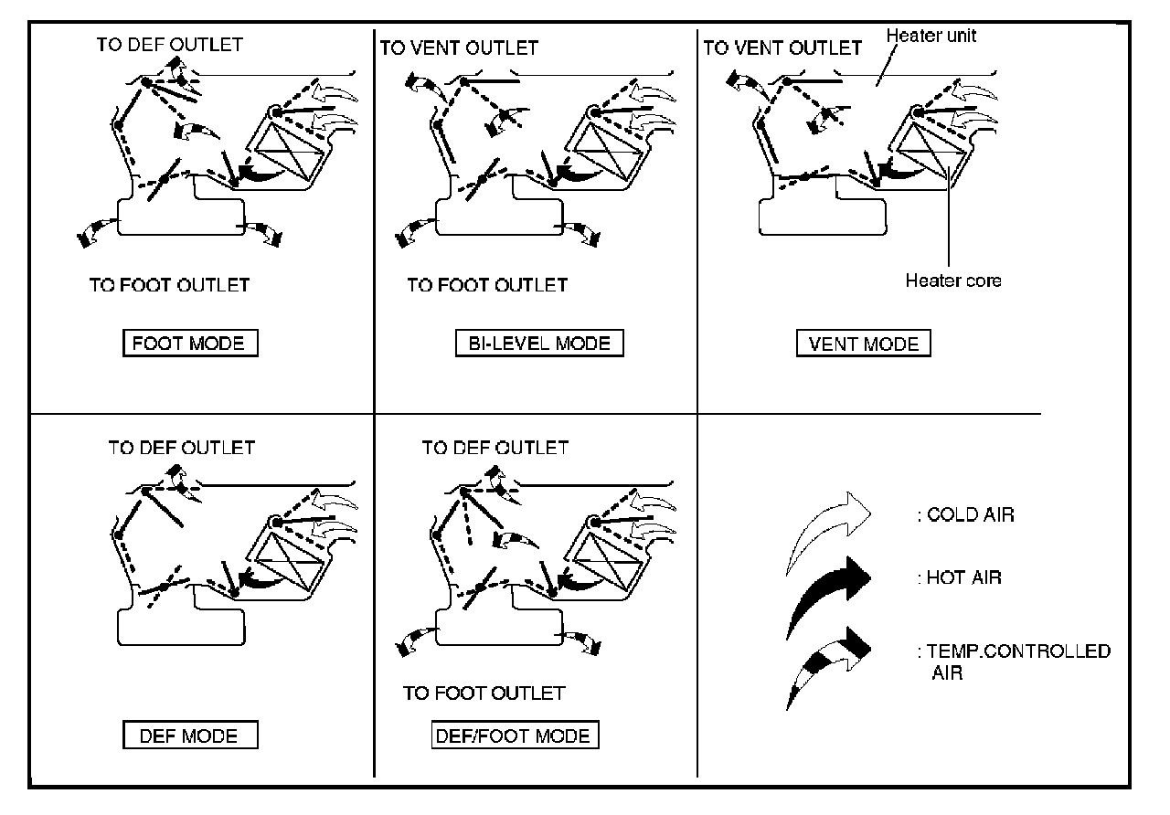 When the temperature control knob is in the "COLD" position, the air mix door closes to block the flow air to the heater core.
