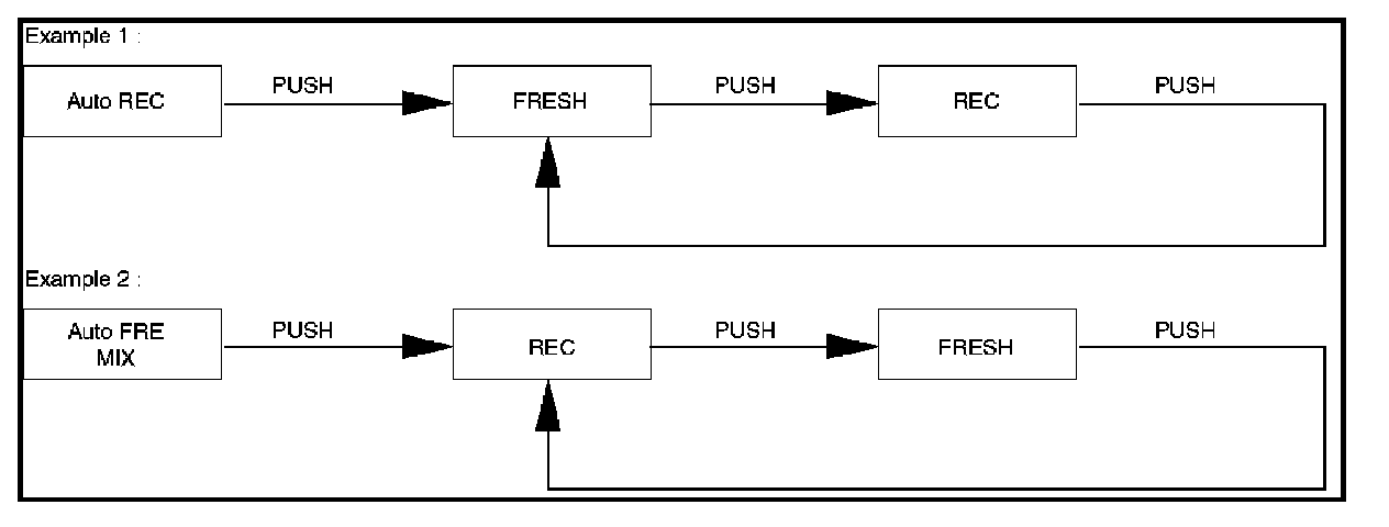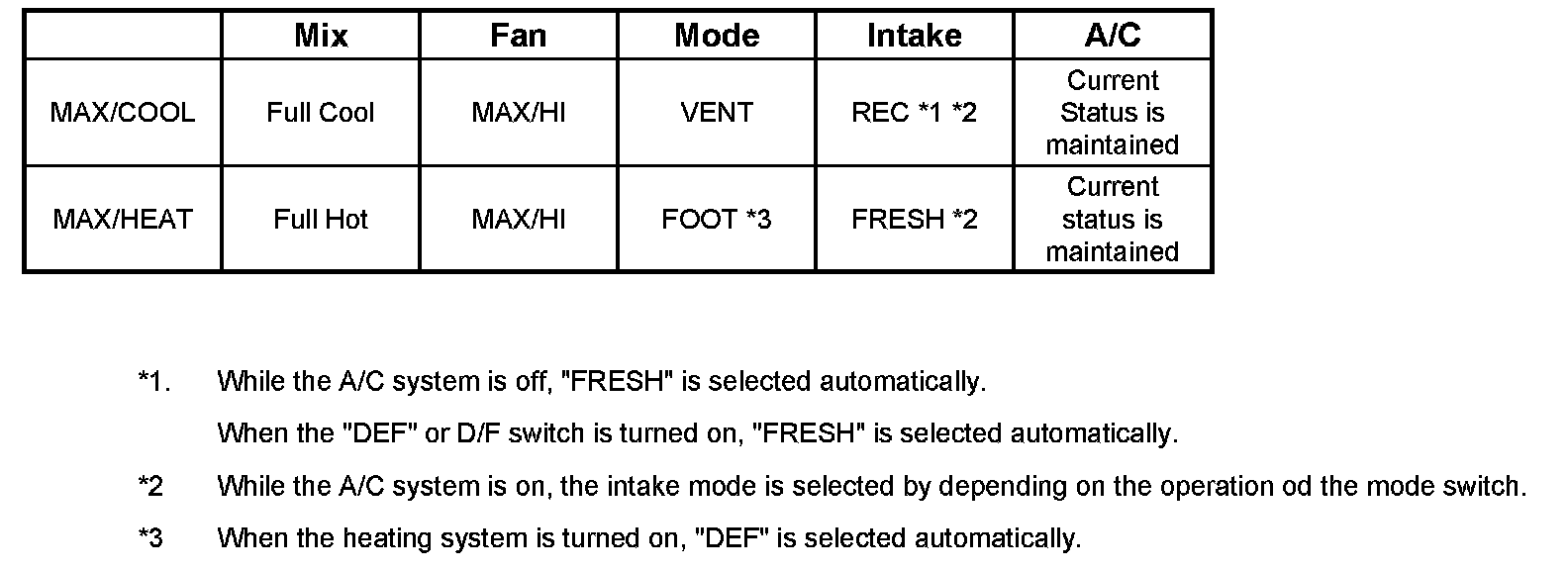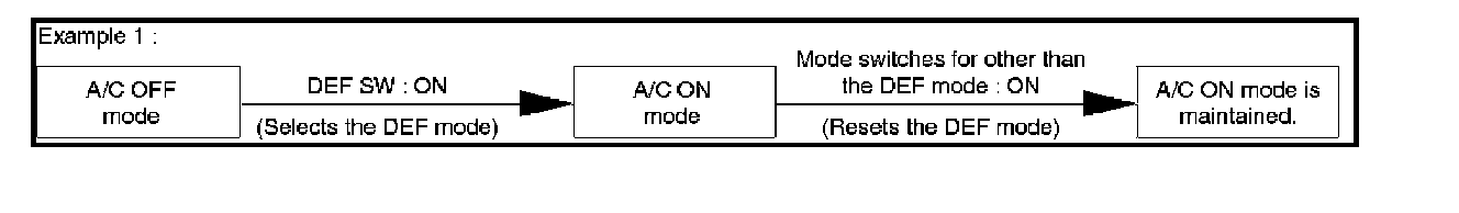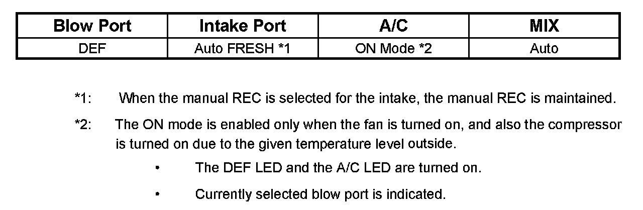 1. The A/C LED remains turned on even if the compressor has been turned off because of the given outside air temperature level. In this case, however, the AUTO or DEF switch must be turned on and the A/C On mode must also be turned on (by the MAX/C mode).