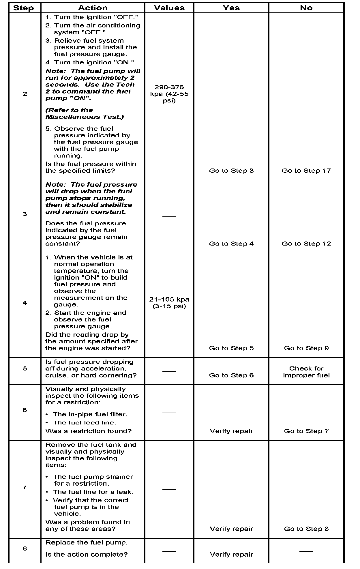 4. Fuel pressure that drops off during acceleration, cruise, or hard cornering may case a lean condition. A lean condition can cause a loss of power, surging, or misfire. A lean condition can be diagnosed using a Tech 2. If an extremely lean condition occurs, the oxygen sensor(s) will stop toggling. The oxygen sensor output voltage(s) will drop below 500 mV. Also, the fuel injector pulse width will increase.