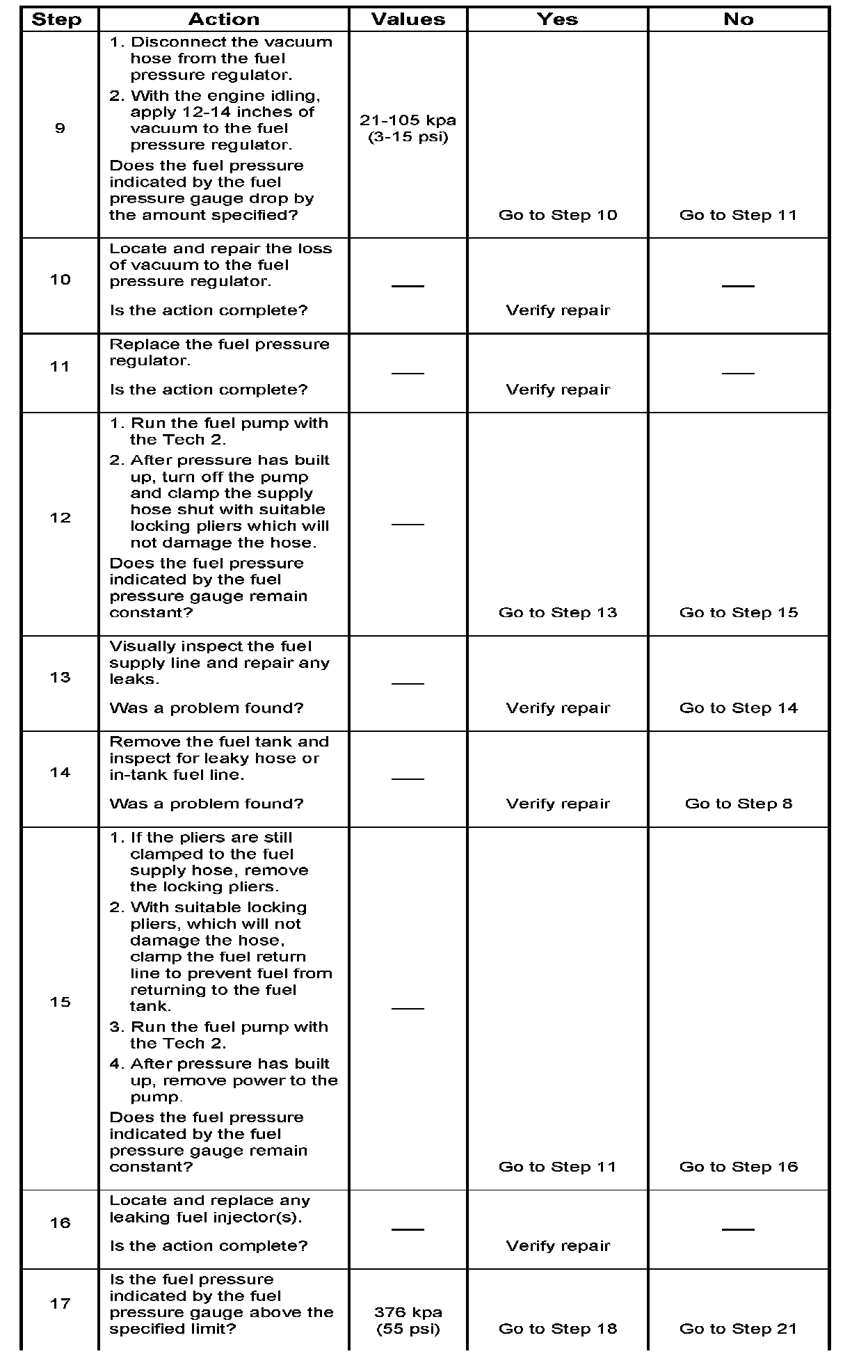 22. Restricting the fuel return line causes the fuel pressure to rise above the regulated fuel pressure. Command the fuel pump "ON" with the Tech 2. The fuel pressure should rise above 376 kpa (55 psi) as the fuel return line becomes partially closed.