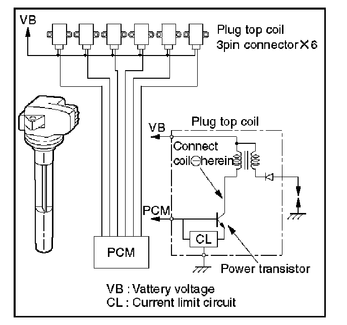 The PCM applies 5 V signal voltage to the ignition coil requiring ignition. This signal sets on the power transistor of the ignition coil to establish a grounding circuit for the primary coil, applying battery voltage to the primary coil.