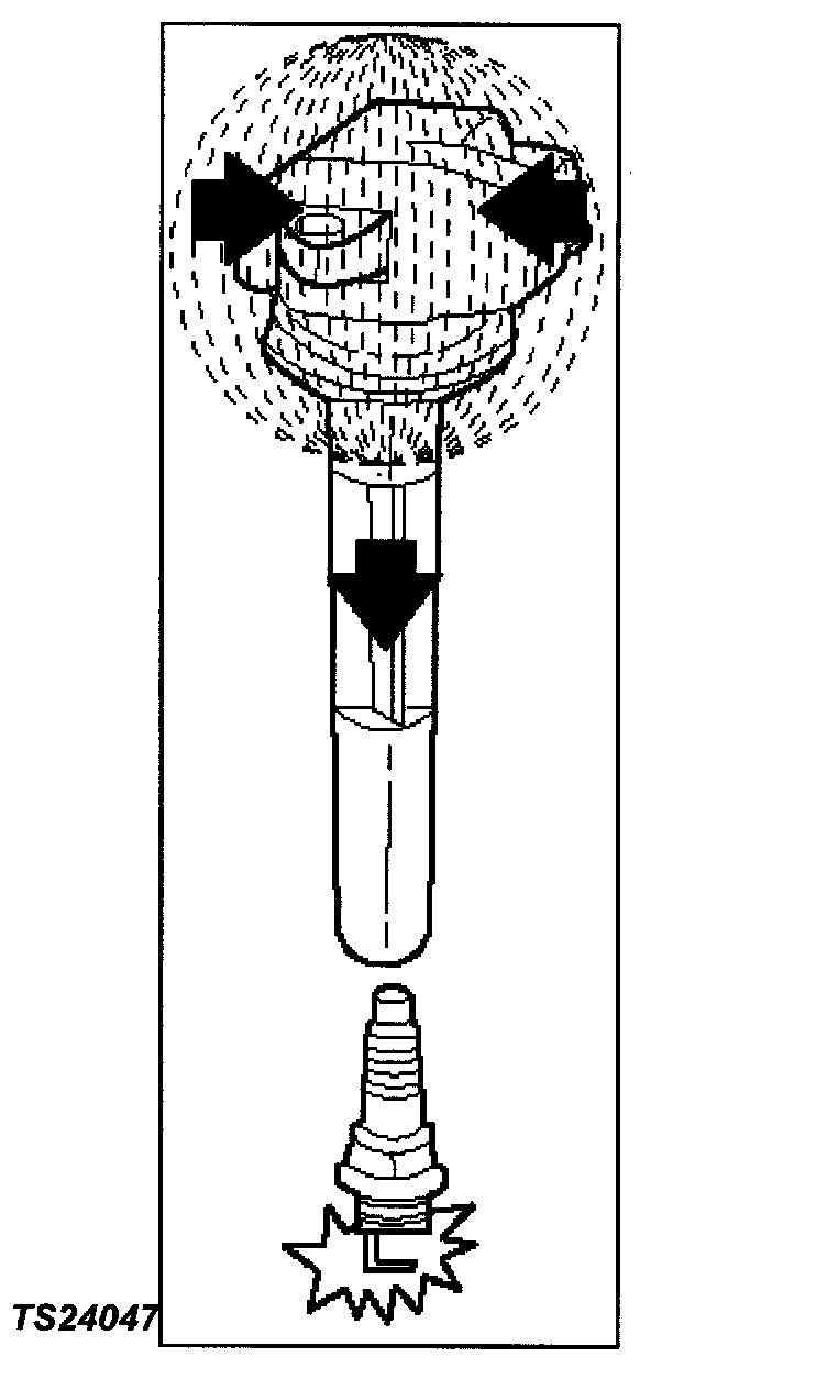 At the ignition timing, the PCM stops sending the 5 V signal voltage. Under this condition the power transistor of the ignition coil is set off to cut the battery voltage to the primary coil, thereby causing a magnetic field generated in the primary coil to collapse. On this moment a line of magnetic force flows to the secondary coil, and when this magnetic line crosses the coil, high voltage induced by the secondary ignition circuit to flow through the spark plug to the ground.