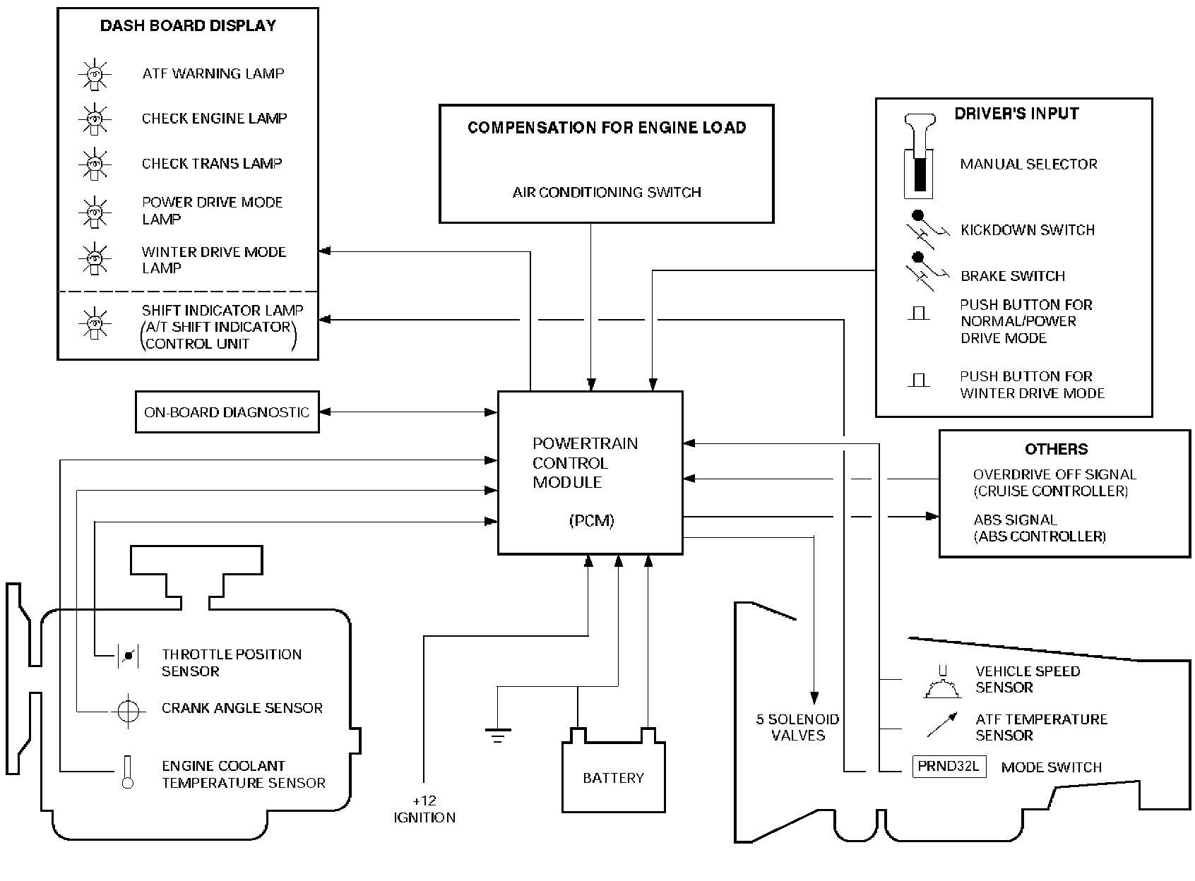 If a major system failure occurs which could affect safety or damage the transmission under normal vehicle operation, the diagnostic system detects the fault and overrides the Powertrain Control Module (PCM).