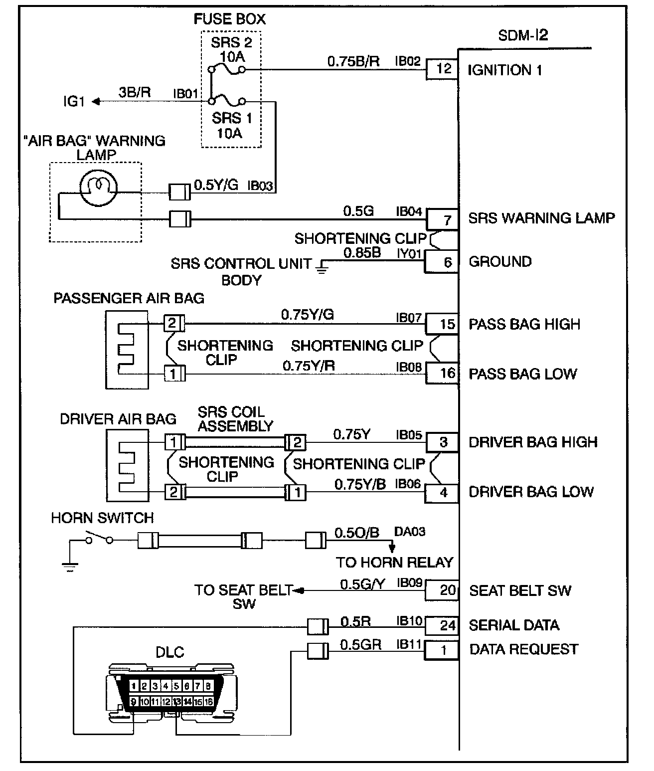 The SRS consists of the Sensing and Diagnostic Module (SDM), the driver air bag assembly, the SRS coil assembly, the passenger air bag assembly, and the "AIR BAG" warning lamp in the instrument cluster. The SDM, SRS coil assembly (driver side only), driver air bag assembly, passenger air bag assembly and connector wire make up the deployment loops. The function of the deployment loops is to supply current through air bag assembly, which will cause deployment of the air bags in the event of a frontal crash of sufficient force, up to 30 degrees off the centerline of the vehicle. The air bag assemblies are only supplied enough current to deploy when the SDM detects vehicle velocity changes severe enough to warrant deployment.