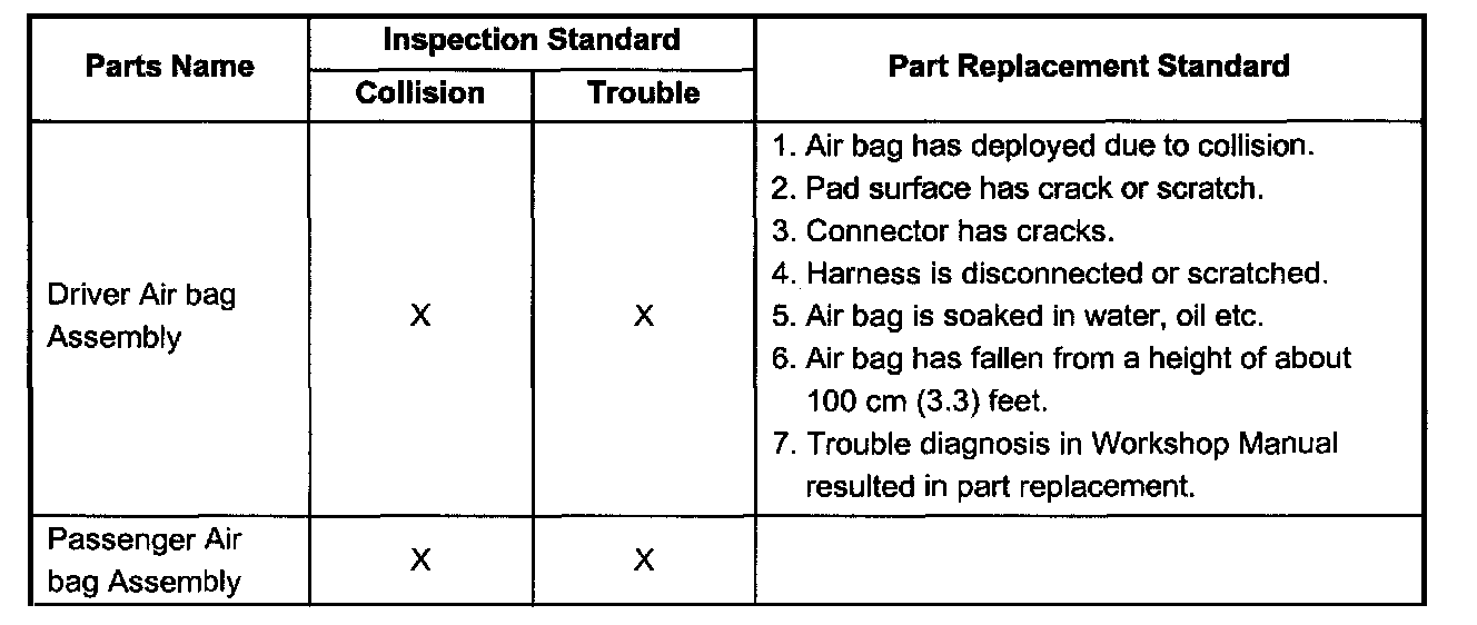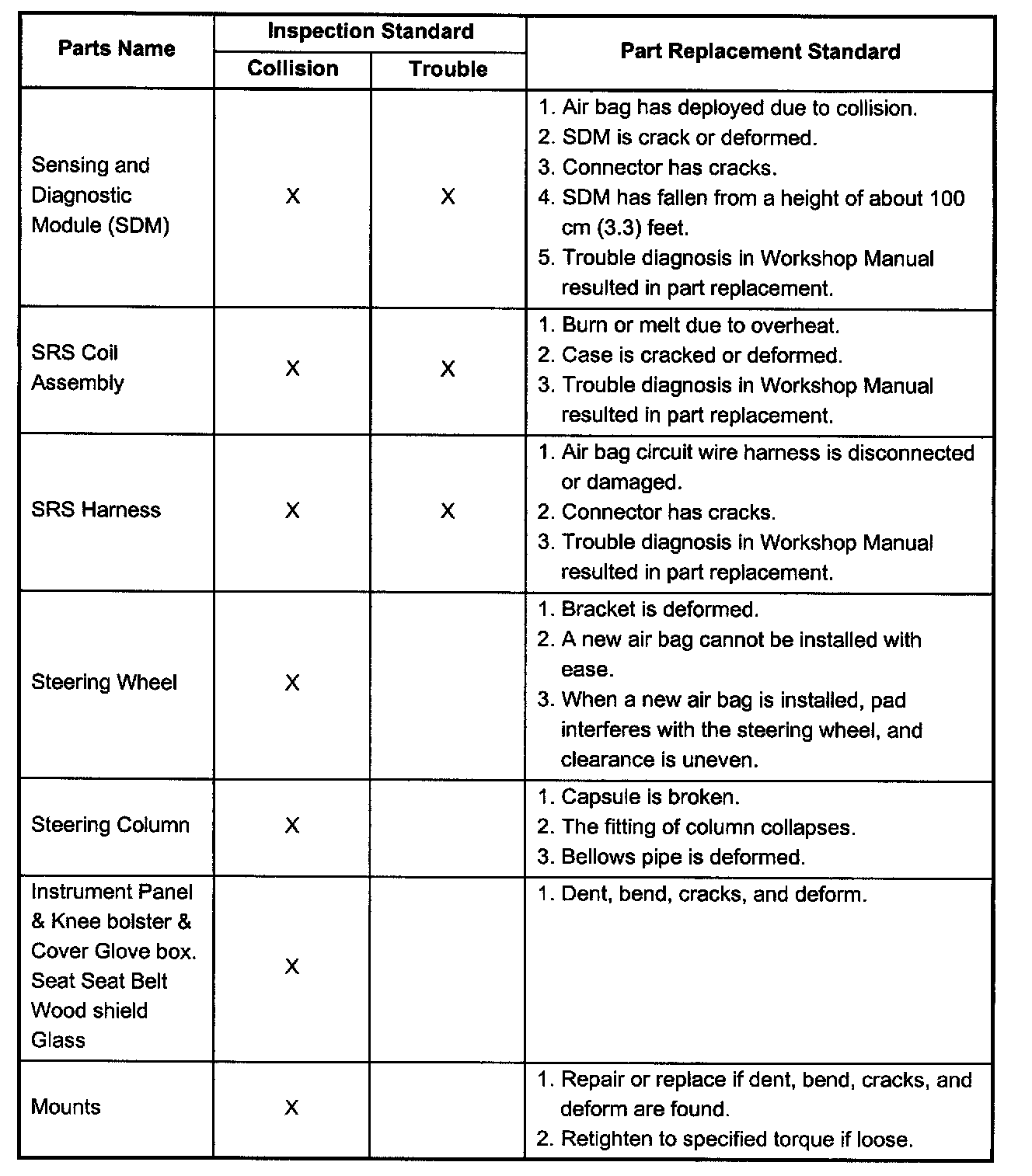 CAUTION: Certain SRS components must be replaced after a frontal crash involving air bag deployment.In all types of accidents regardless of "Air Bag" deployment, visually inspect all of the following components and replace as required: